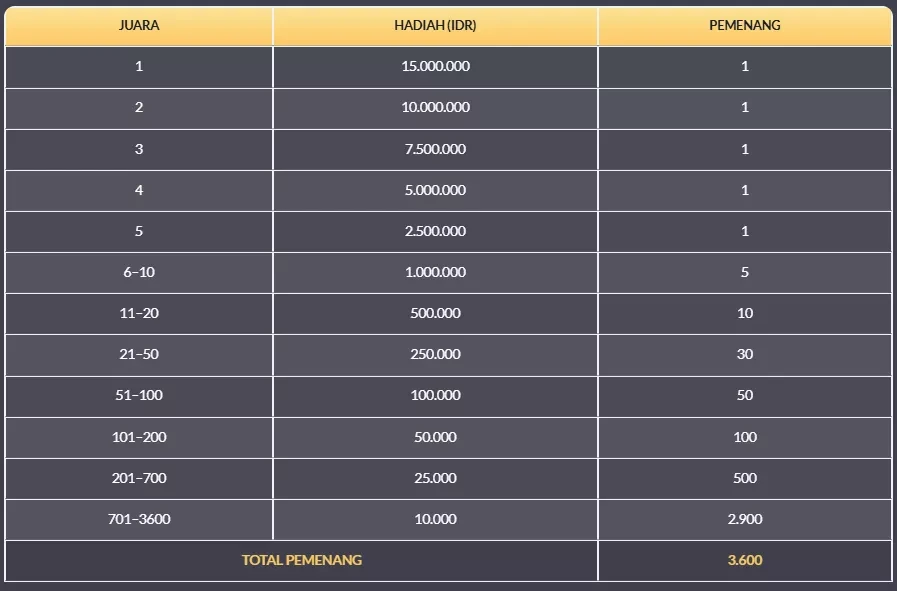 2. Total hadiah Rp 2,2 MILIAR akan dibagikan kepada 72.000 pemain setiap hari selama periode promo berlangsung.